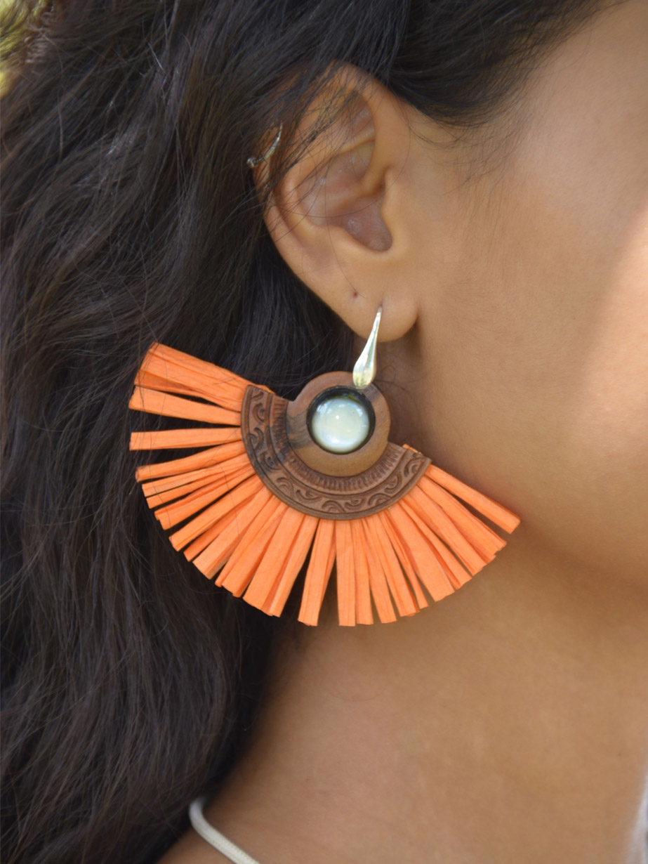 Boucles d’oreilles « Merehau » en bois d’acajou poli et gravé, serti d’une nacre polie, éventail à frange raphia orange – crochet en argent 925 millième.