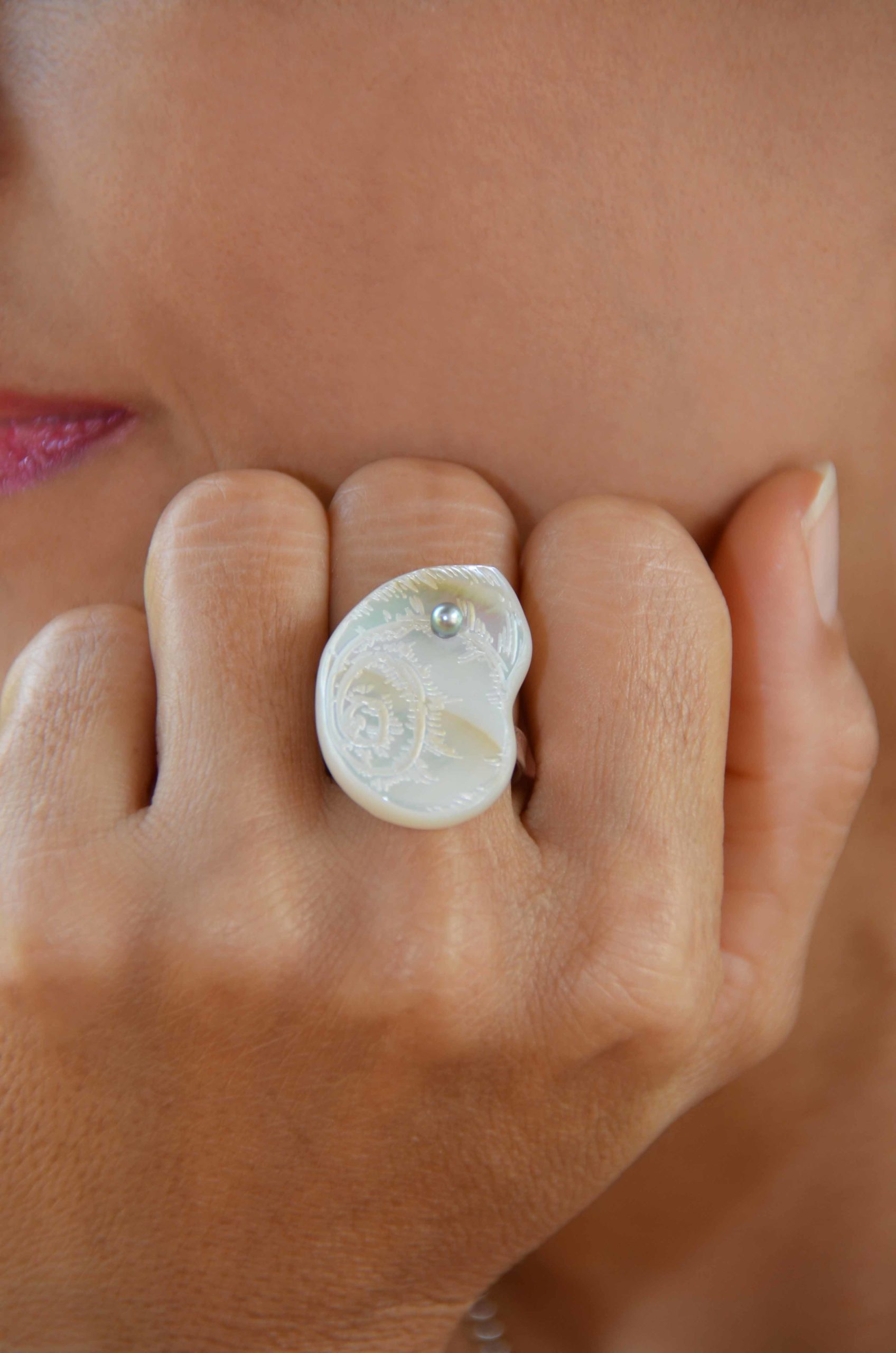 Bague argent 925 millième ajustable – nacre claire polie et gravée, serti d’un keshi de Tahiti.
