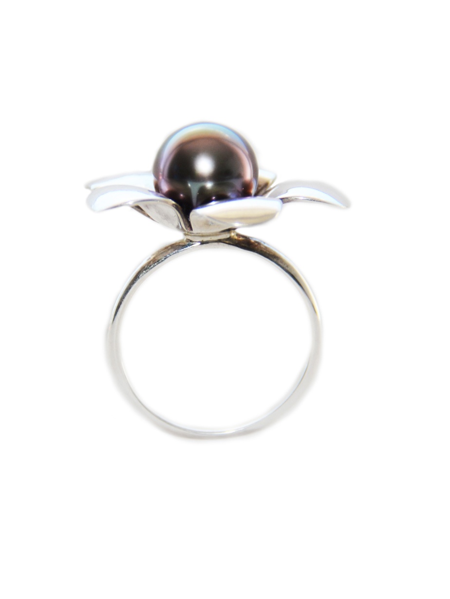 Bague en argent 925 en forme de fleur, une perle ronde de Tahiti (des îles Tuamotu / Gambier), diamètre Ø 9,7mm – qualité A.