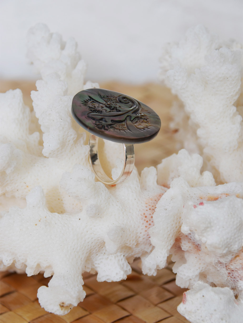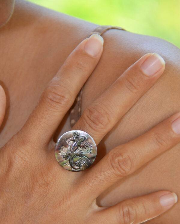 Bague argent 925 millième ajustable – nacre polie et gravée « Gecko » couleur foncée
