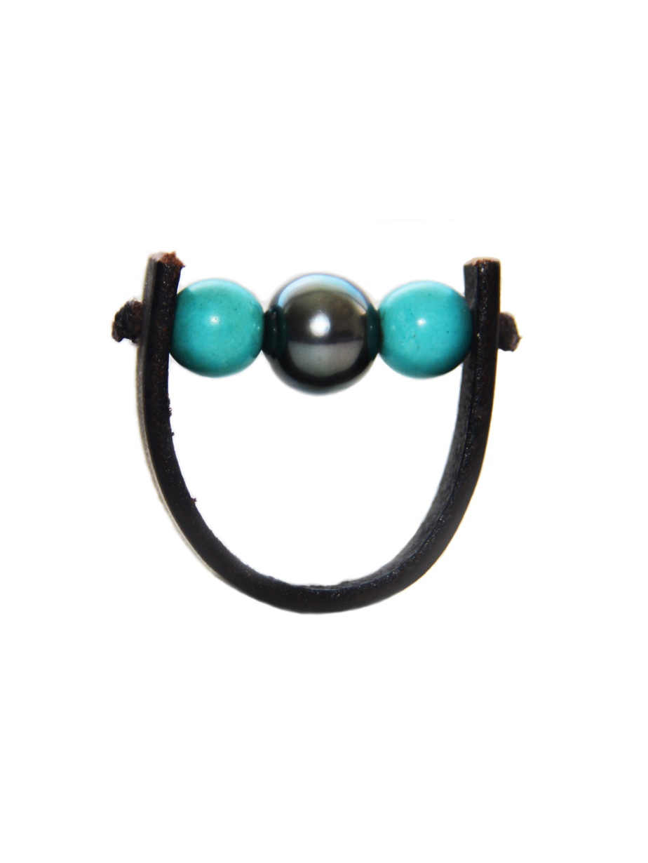 La bague Poeti en cuir plat est agrémentée d’une perle ronde de Tahiti et de deux turquoises synthétiques reconstituées de diamètre Ø6mm.