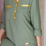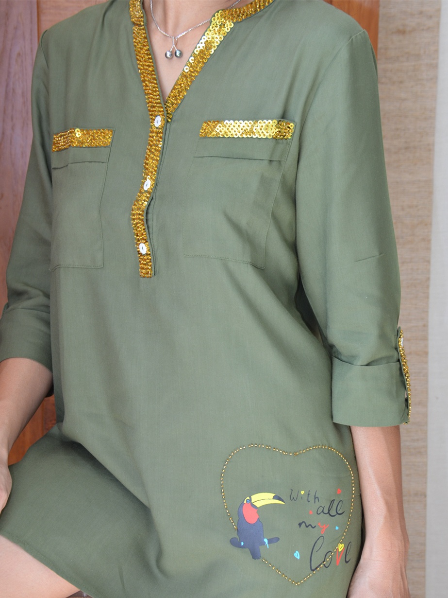 Col en « V », une ligne de trois boutons et strass doré, deux poches surpiquées à la poitrine avec le haut de poche en strass doré.