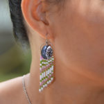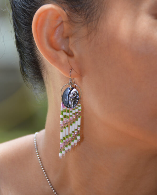 Boucles d’oreilles « hippie chic » nacre polie et gravée – perles de rocailles – crochet en argent 925 millième.
