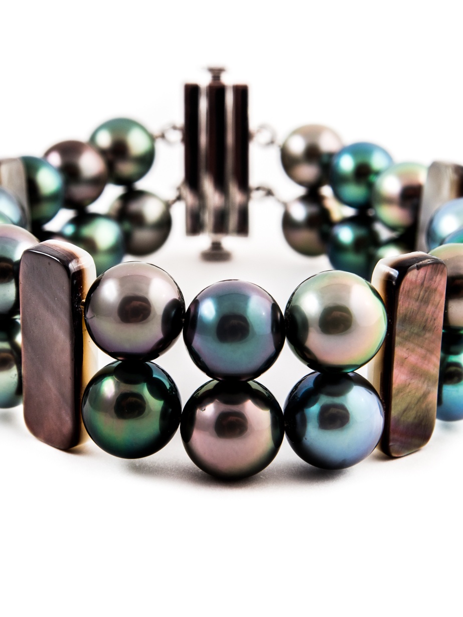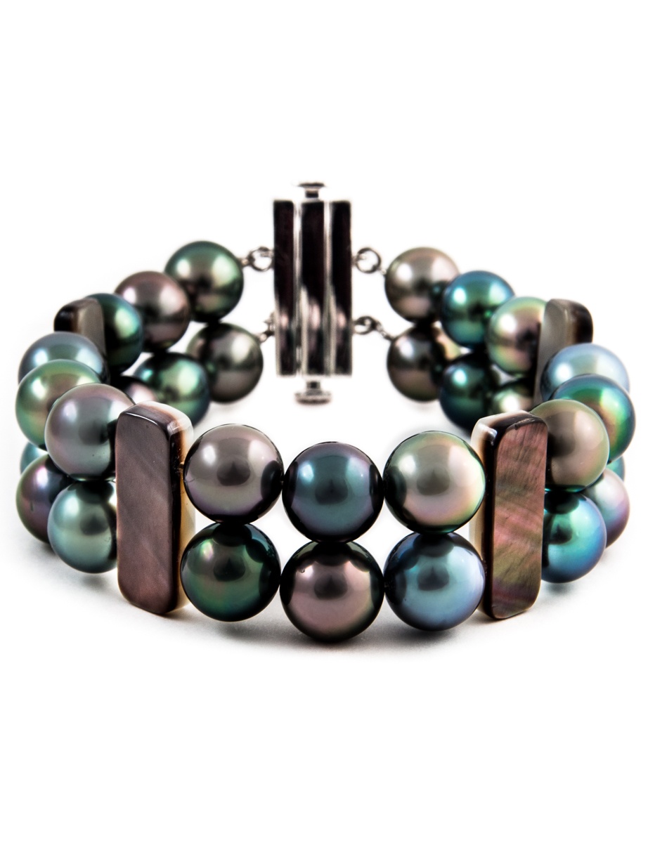 Bracelet de 2 rangées de 15 perles rondes de Tahiti : Ø8.7 à 9.3