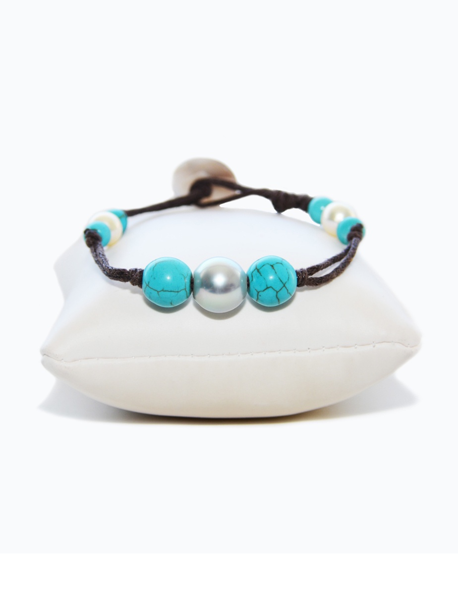 Bracelet en coton marron 1 perle ronde de Tahiti, 2 perles d’eau douce et 6 turquoises synthétiques reconstituées, avec une nacre en guise de fermoir.