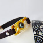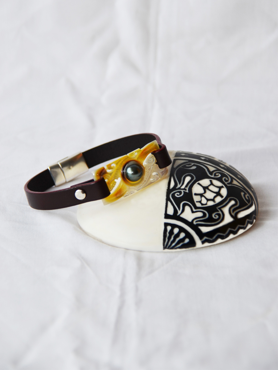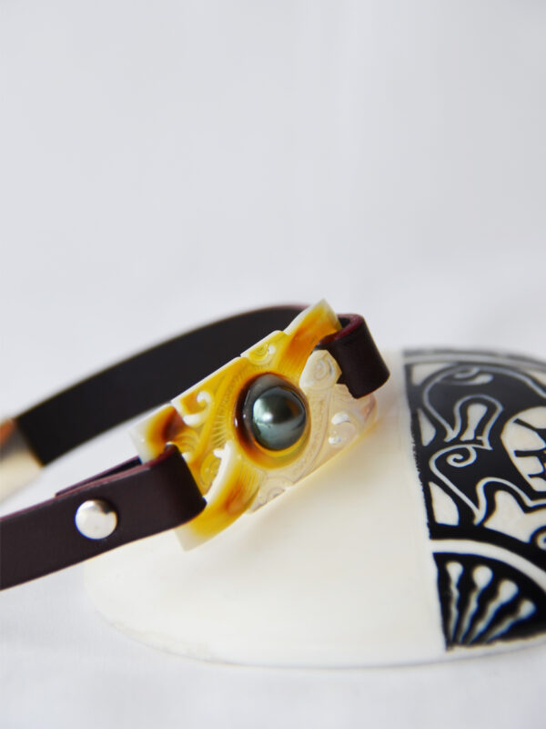 Bracelet « Temana » cuir bordeaux foncé, nacre polie et gravée, serti d’une perle de Tahiti – fermoir aimanté argent 925 millième.