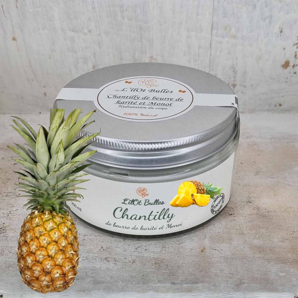 La crème Chantilly de beurre de karité et Monoï parfumé à l’ananas en vente sur Ohlalagooddeal rend votre peau douce et la protège contre les agressions climatiques.