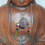 Avec perles de rocaille, pierres lava, pièces de monnaies chinoise et pompon