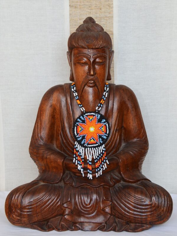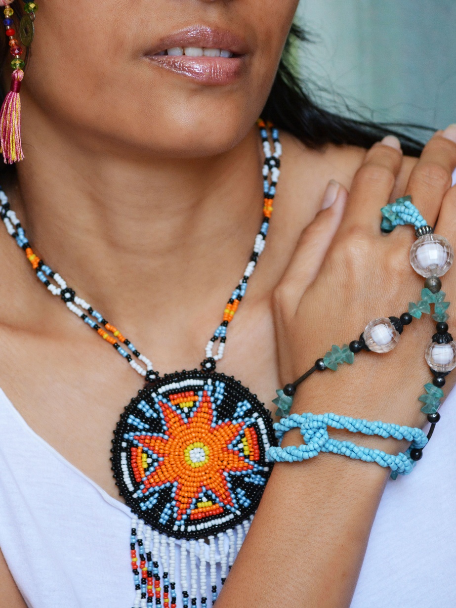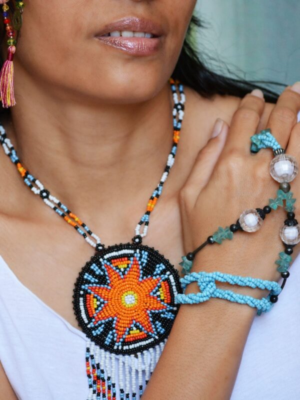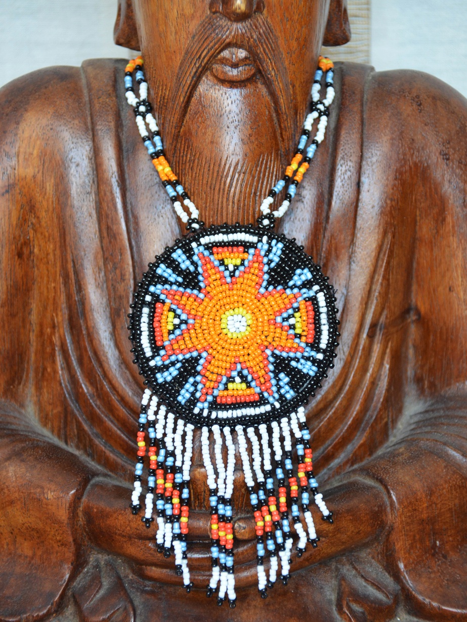 Collier Matarii en vente sur Ohlalagooddeal , d’inspiration amérindienne et entièrement fait de perles de rocaille de différentes couleurs.