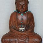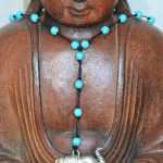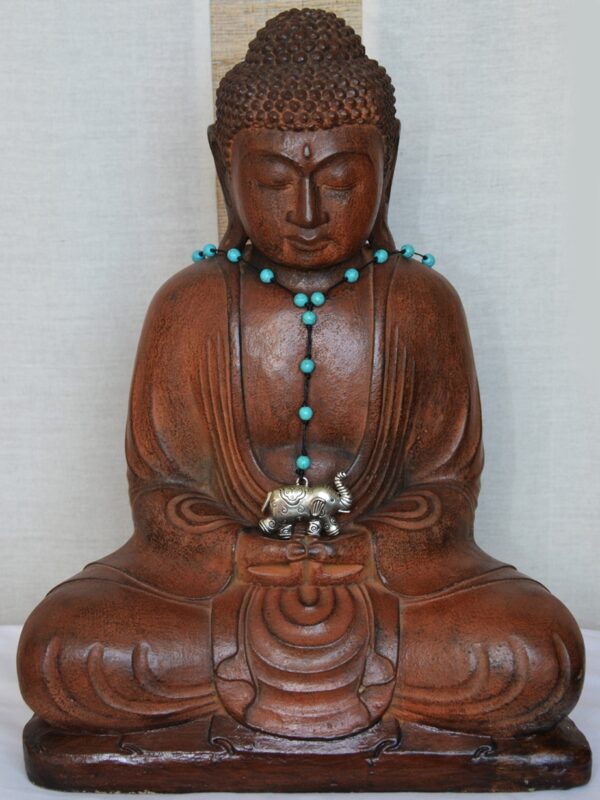 Composé d’un tour de cou en cuir noir, de perles turquoises synthétiques reconstituées et d’un pendentif forme éléphant aux motifs hindou.