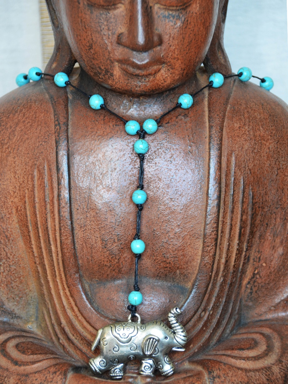 Composition du bijou fantaisie : Coton en cuir noir, perles turquoises synthétiques reconstituées et pendentif forme éléphant en métal argenté vieilli avec des motifs hindou