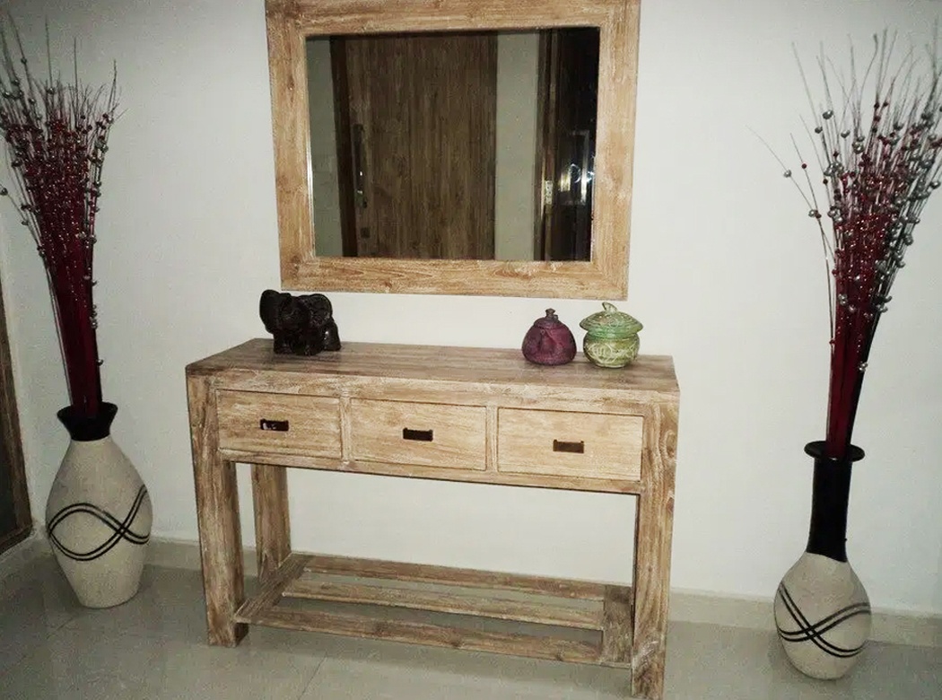 Découvrez cette console en bois de teck brut ! Elle dispose de 3 tiroirs dans lesquelles vous pourrez ranger votre nécessaire.