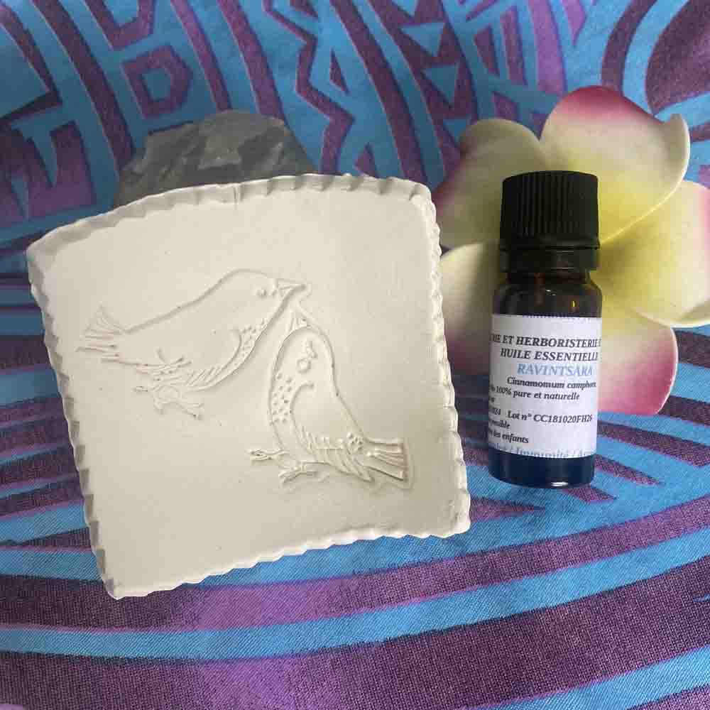 Diffuseur céramique coupelle oiseaux/ravintsara en vente sur Ohlalagooddeal, proposé par l’huilerie et herboristerie de Tahiti