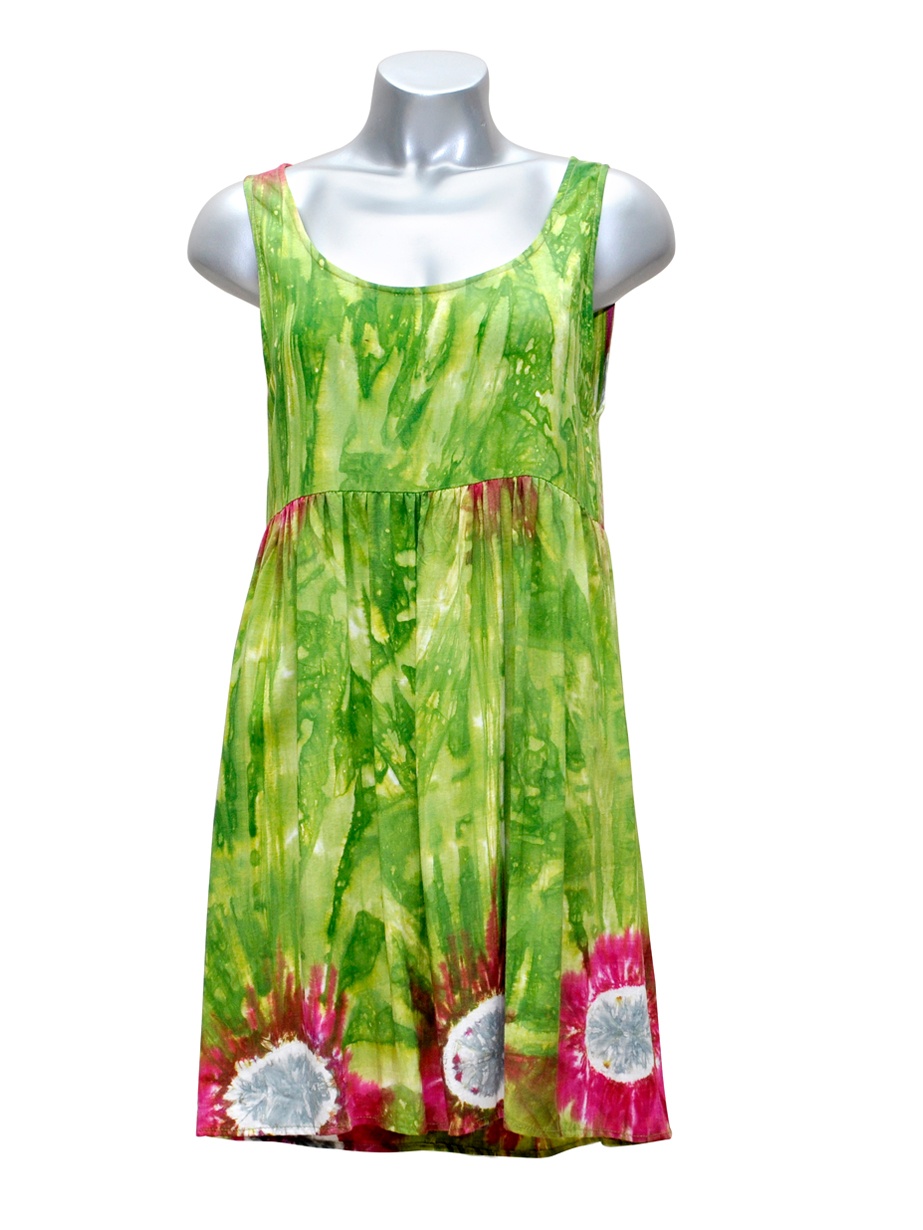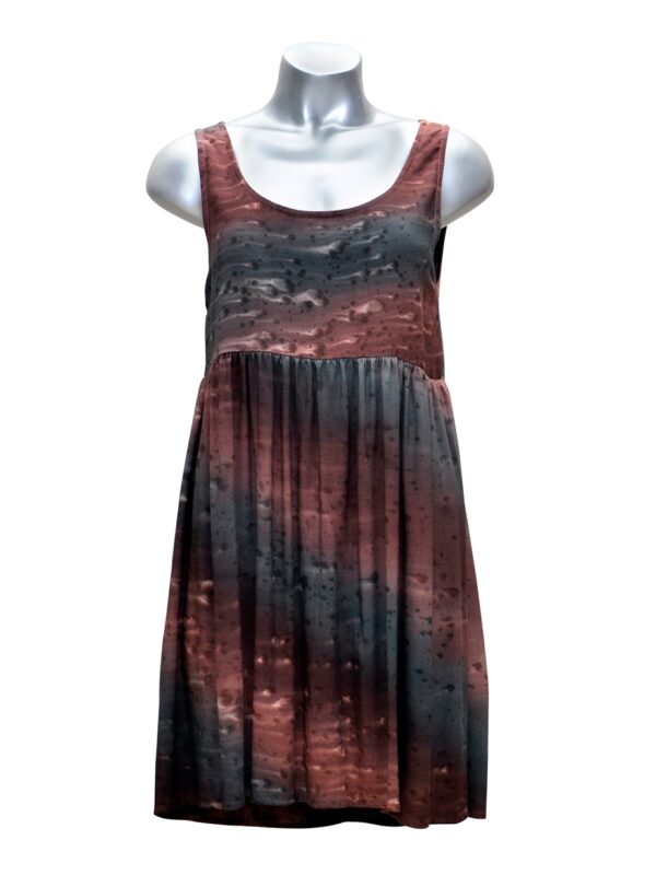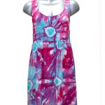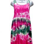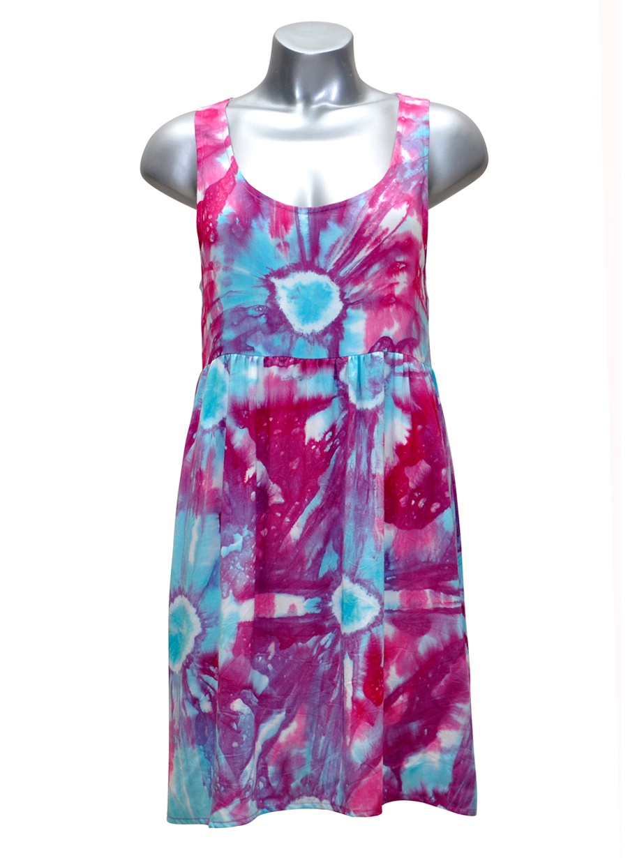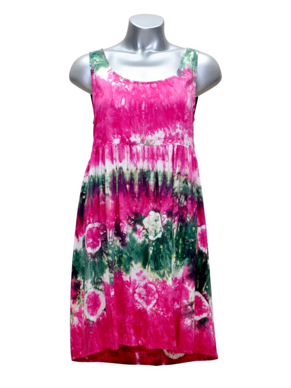 Robe d’été, légère, courte et fluide sans manches, imprimée tie and dye.