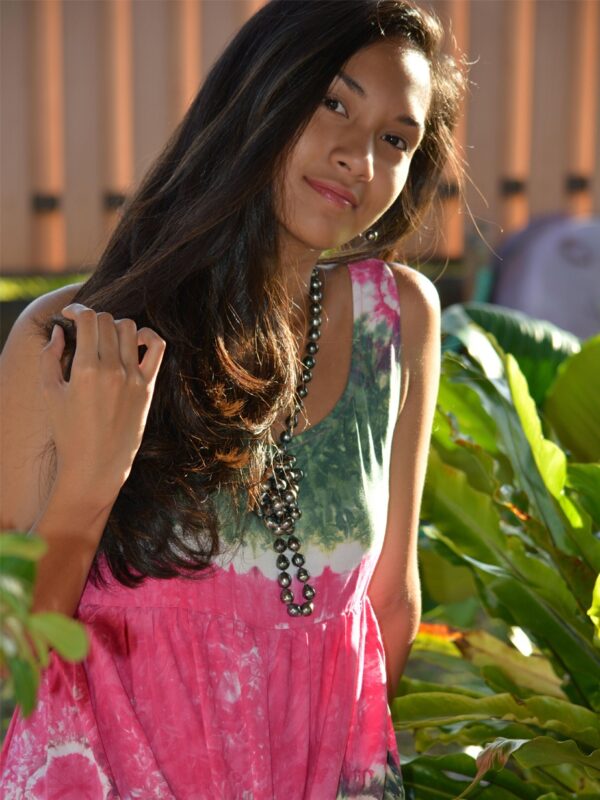 Robe légère en coton imprimée tie and dye bicolor avec une ligne de boutons dans le dos.