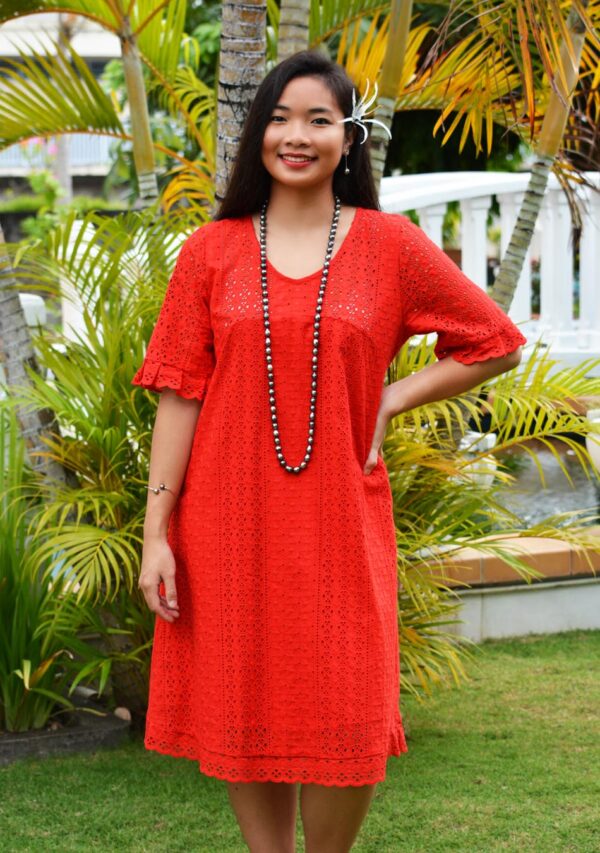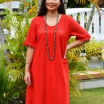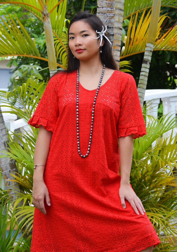 La robe Pivoine chic de la marque Sandy Stylisme et Couture est toute en broderie de coton. Sa coupe large et évasée la rend confortable à porter. Ses manches sont courtes et évasées avec froufrou. Peut être portée de jour comme de nuit et convient à différentes circonstances.