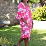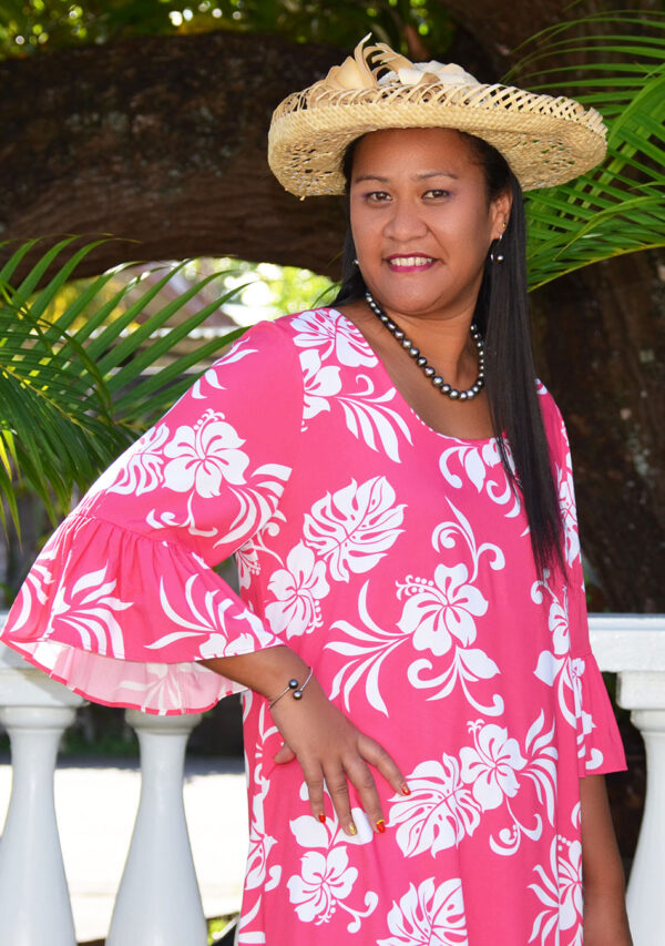 La robe Heiva mi longue de Sandy Stylisme et Coutureest en fibranne, avec des motifs de feuilles tropicales., de couleur rose pivoine. Elle peut être portée de jour comme de nuit, par conséquent, elle peut être déclinée pour convenir à différentes circonstances . Elle a des manches mi-longue. Sa coupe large et évasée la rend confortable à porter. Ce style de robe est particulièrement apprécié des Polynésiennes, car elle ne sert pas au corps.