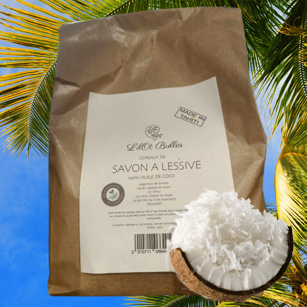 Savon à lessive en copeaux 100% coco en vente sur Ohlalagooddeal et proposée par L’îlot Bulles
