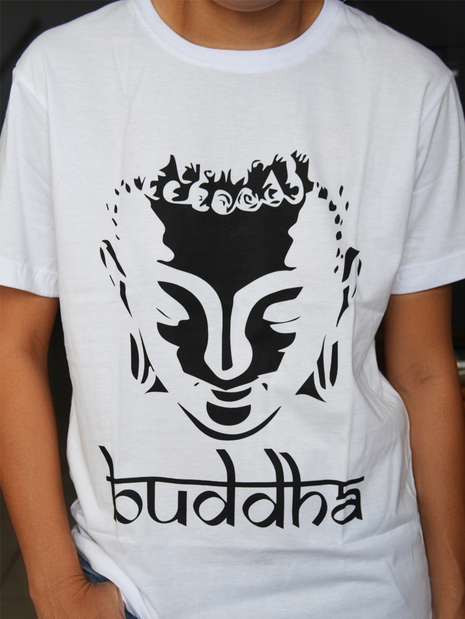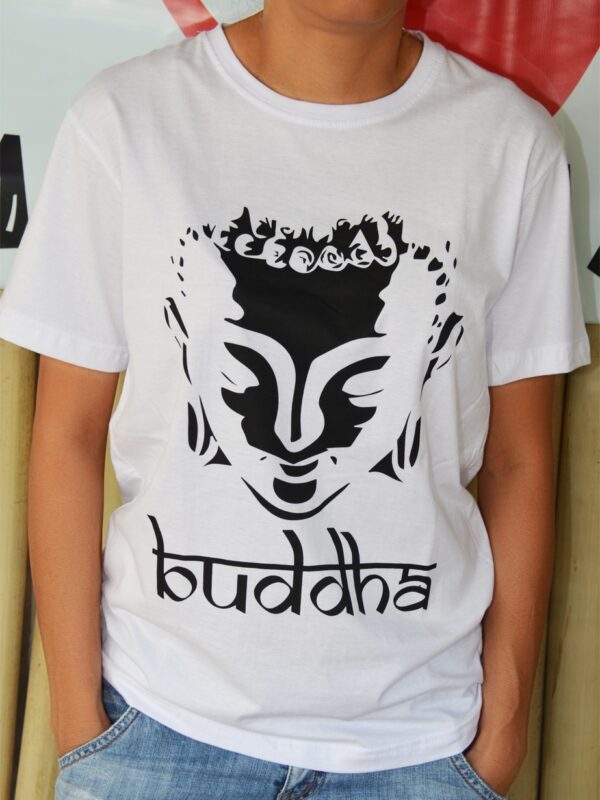 T-shirt blanc imprimé tête de Bouddha en vente sur Ohlalagooddeal, votre plateforme de vente en ligne et proposé par la boutique Mimpi Manis.