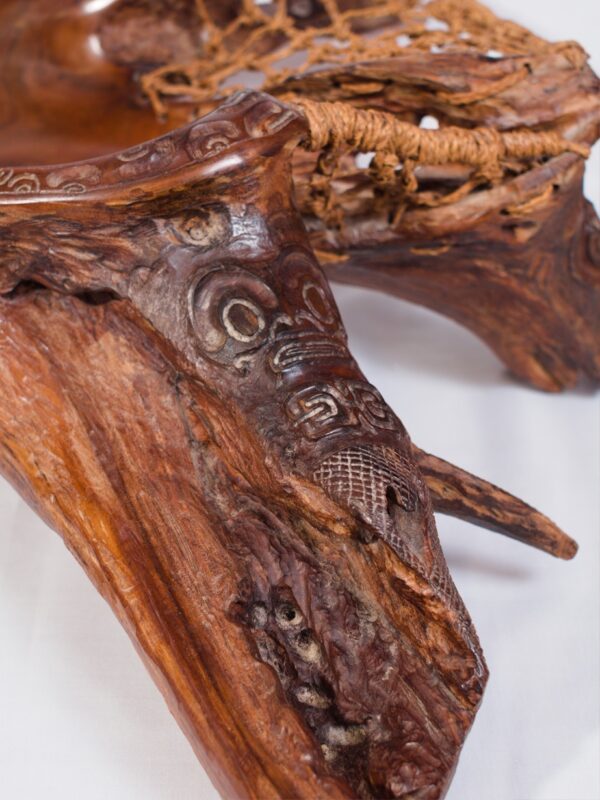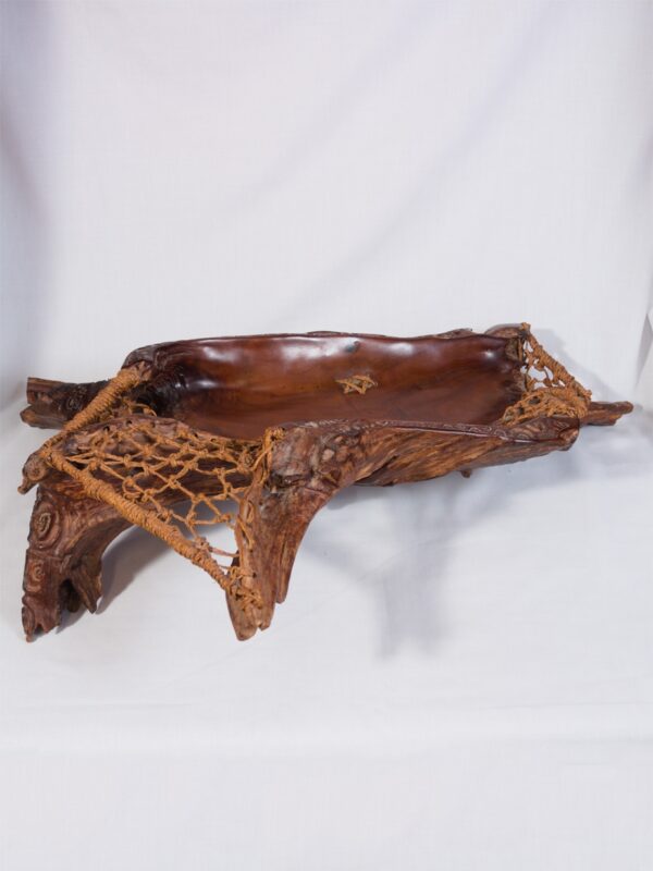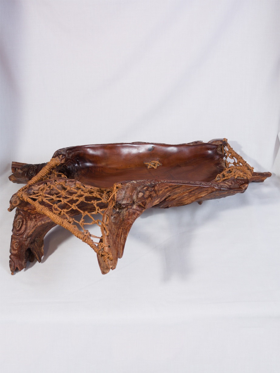 Umete sculpté dans une souche de Miro, pourvu d’un filet fait en fibre de coco. La partie interne qui forme le bol est polie et vernis.